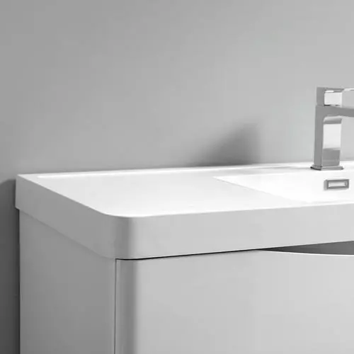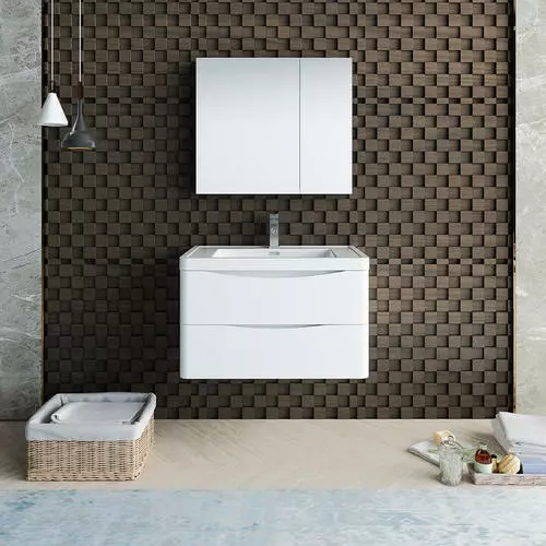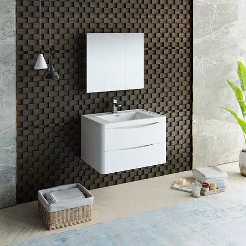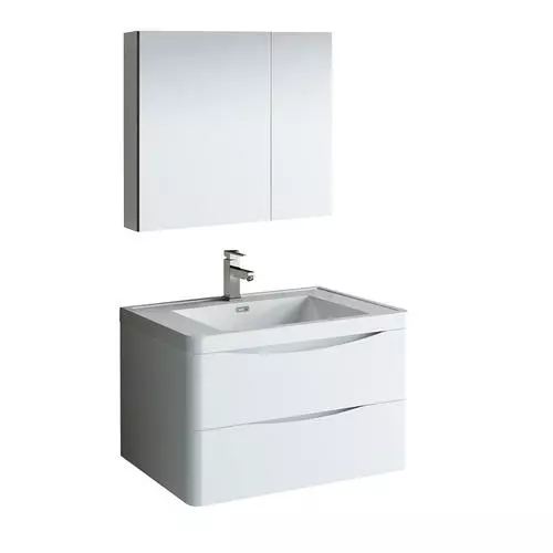 With its stylish White finish, the Fresca Tuscany Wall Hung Modern Bathroom Vanity adds a contemporary touch to any bathroom. The cabinet offers great storage with soft-closing drawers, just perfect for organizing all of your daily essentials. The drawers feature integrated handles that beautifully complement the minimalist look. Gracing the top of the cabinet is an eye-catching white acrylic-resin countertop/sink with a unique rimmed edge and integrated overflow. The sink has been pre-drilled to accommodate a single hole faucet (included). The set also includes p-trap, pop-up drain and installation hardware. This ensemble comes with a fully mirrored medicine cabinet with two adjustable glass shelves, to complete the look. This chic vanity ensemble is available in multiple colors and makes a stylish statement in any home.