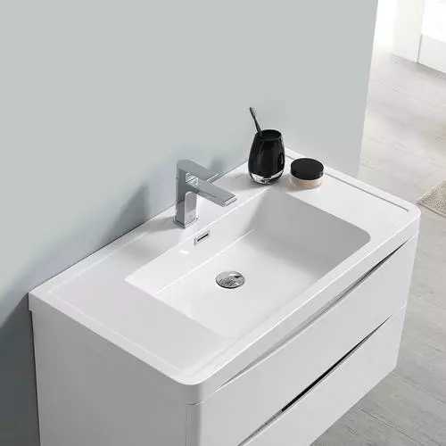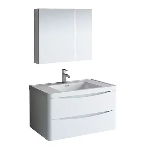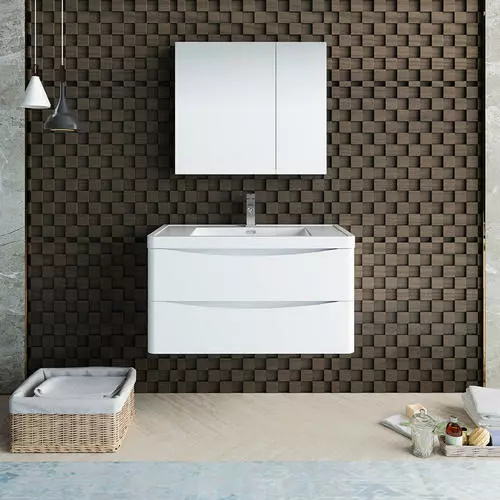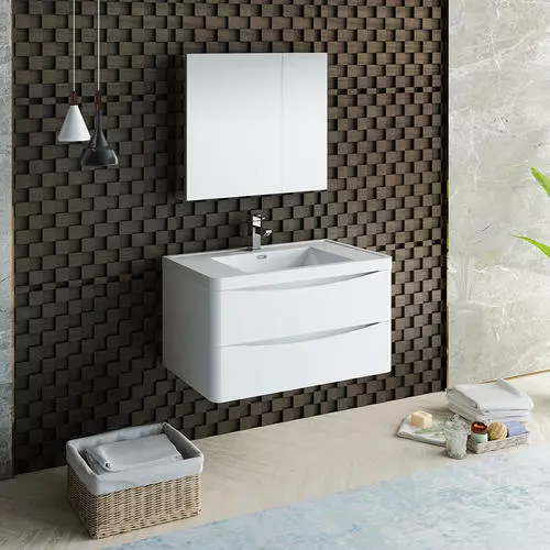 With its stylish White finish, the Fresca Tuscany Wall Hung Modern Bathroom Vanity adds a contemporary touch to any bathroom. The cabinet offers great storage with soft-closing drawers, just perfect for organizing all of your daily essentials. The drawers feature integrated handles that beautifully complement the minimalist look. Gracing the top of the cabinet is an eye-catching white acrylic-resin countertop/sink with a unique rimmed edge and integrated overflow. The sink has been pre-drilled to accommodate a single hole faucet (included). The set also includes p-trap, pop-up drain and installation hardware. This ensemble comes with a fully mirrored medicine cabinet with two adjustable glass shelves, to complete the look. This chic vanity ensemble is available in multiple colors and makes a stylish statement in any home.
