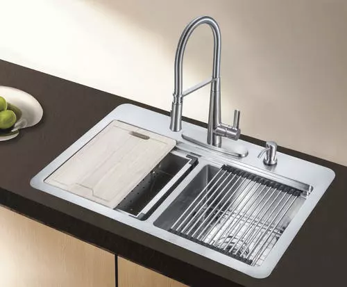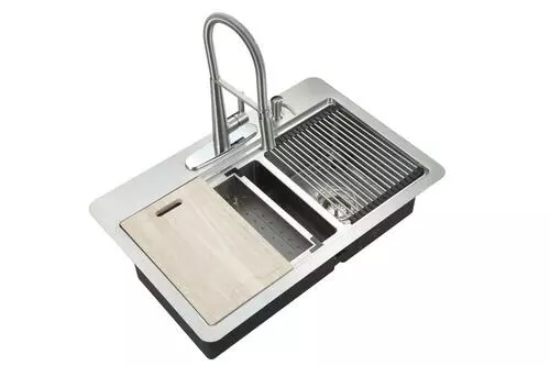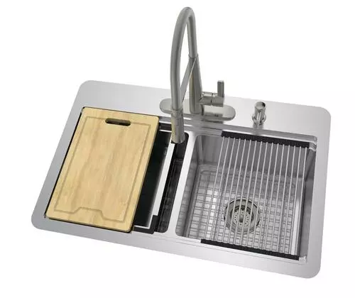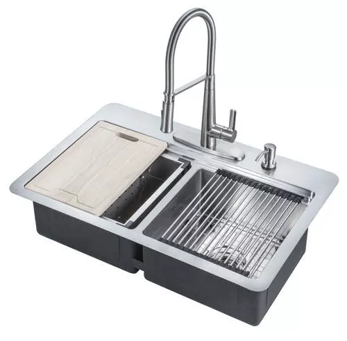 This kit includes a 33″ x 22″ x 9″ dual-mount 50/50 double bowl sink, stainless steel finish ceramic disc one-handle decorative coil kitchen faucet with soap dispenser, oak cutting board, stainless steel colander, drying rack, corrosion resistant stainless steel sink grids, metal strainer baskets, U-channel clips for top-mount, fasteners for under-mount installation, installation instructions and installation templates for both applications. The 18 gauge stainless steel sink can be installed as a top-mount or under-mount to accent any kitchen. The faucet features a dual-function spray head (spray and stream) for ease of use and a matching soap dispenser. The sink kit accessories all nest neatly inside the sink to keep your countertop neat when not in use. It has everything included to make your kitchen the talk of the town.