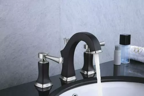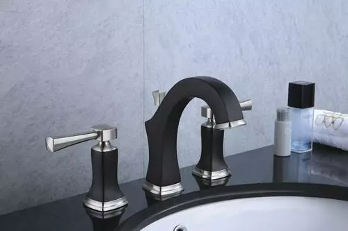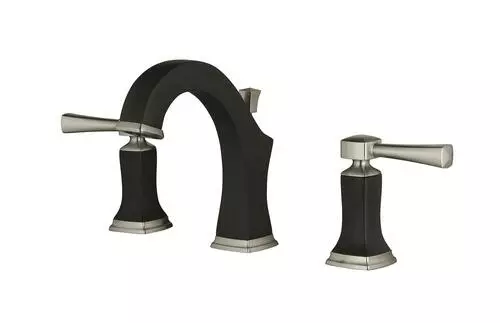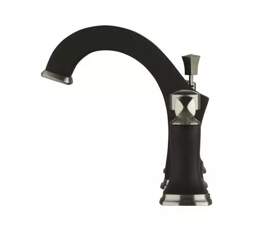 The Tuscany Audrey two-handle widespread bathroom faucet in a chocolate bronze and brushed nickel finish features a 4-1/2″ high and 5-3/8″ long one piece solid cast brass spout. The Audrey has a 8″ centerset, 3 hole installation. The pop-up drain assembly is included. This faucet has a flow rate of 1.2 GPM @ 60 PSI.